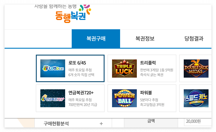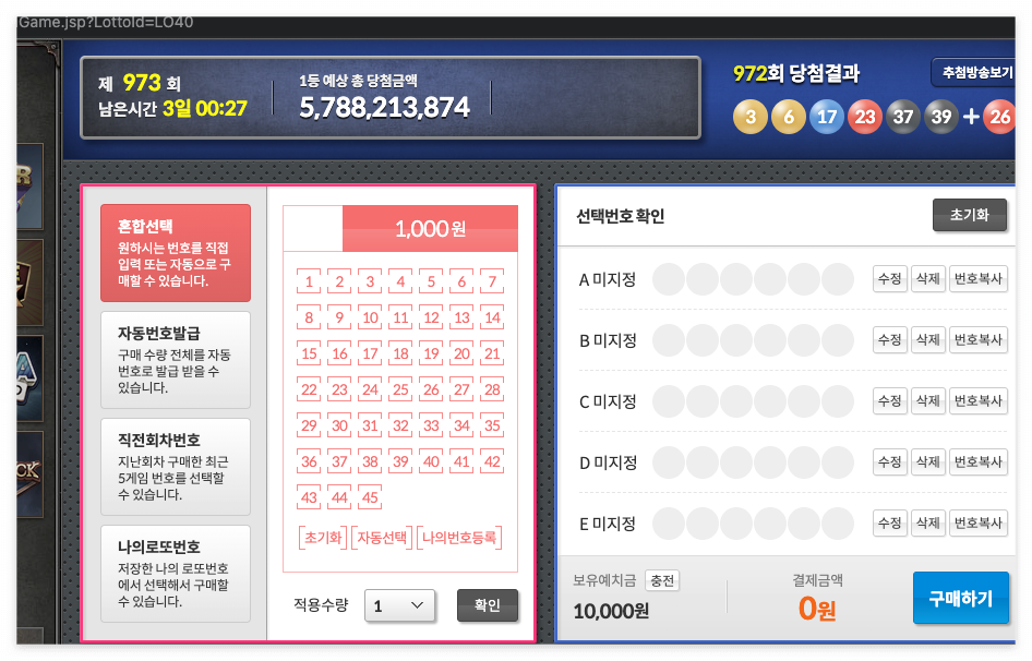 언뜻 인터넷 게임화면 같지만 실제 복권 구매와 같은 인터넷 구매 화면으로 왔다.