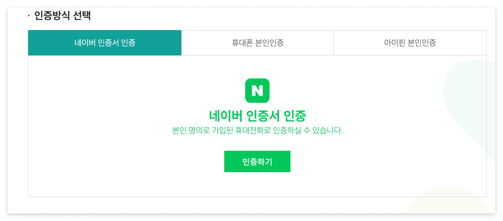인증방식도 기존에 휴대폰인증이외에 네이버 인증서 인증이 추가 되어 보다 간편하게 가입이 가능하다.