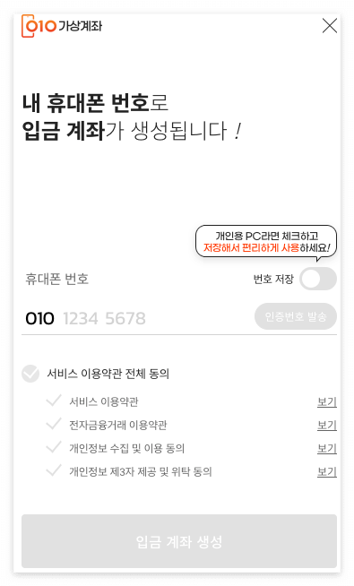 입금계좌 생성을 누르면 입금계좌가 카카오톡 으로 발송된다.